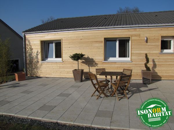 Réalisation d’un bardage bois donnant sur une terrasse. Le bardage a été réalisé en Mélèze avec un traitement AQUA